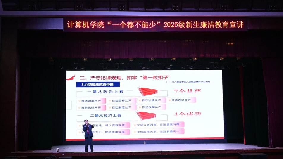 为引导新生筑牢遵纪守法、廉洁自律的思想根基,树立正确的世界观、人生观、价值观,勇担时代赋予的重任,10月24日,3003必赢官网于麓南校区礼堂开展了“扣好第一粒扣子”主题2025级新生廉洁教育活动。本次教育活动由3003必赢官网党委副书记王新辉主讲,学院2025级全体新生到场参加。